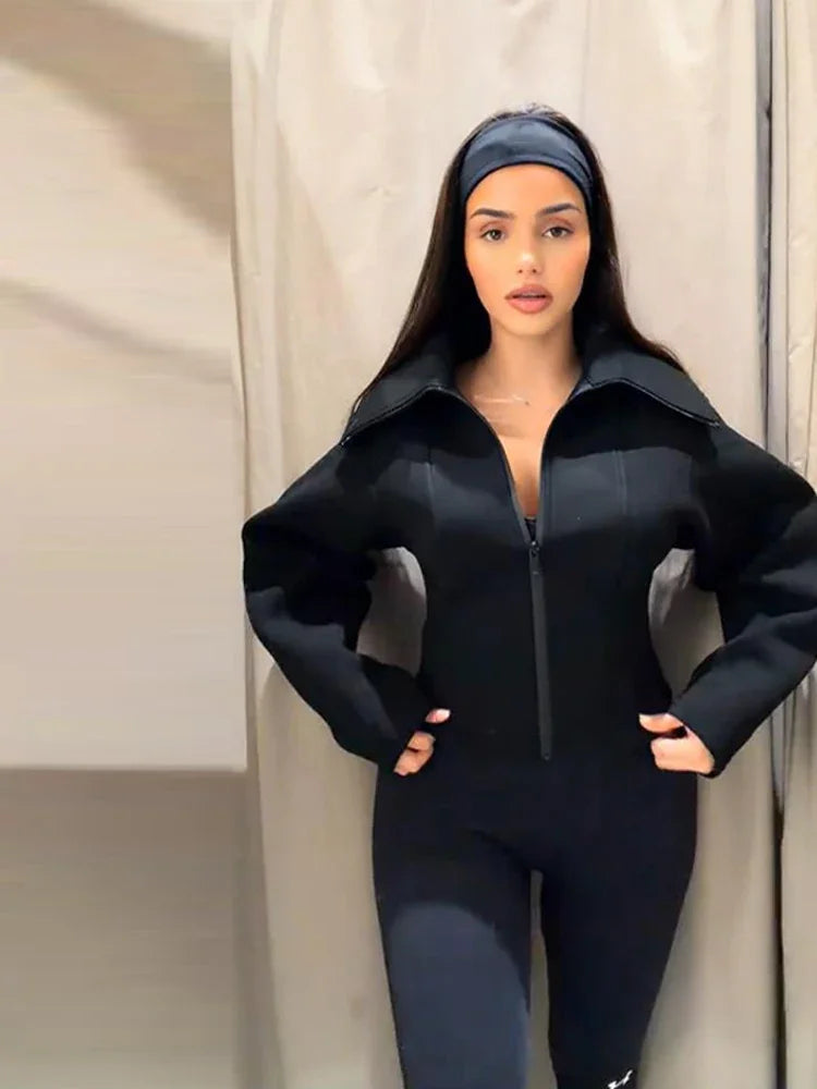 Women Coat Neoprene Jacket Black Long Sleeve Zip-Up Collared Fitted Top Casual Outerwear Spring New Woman Clothes Daily Outfit