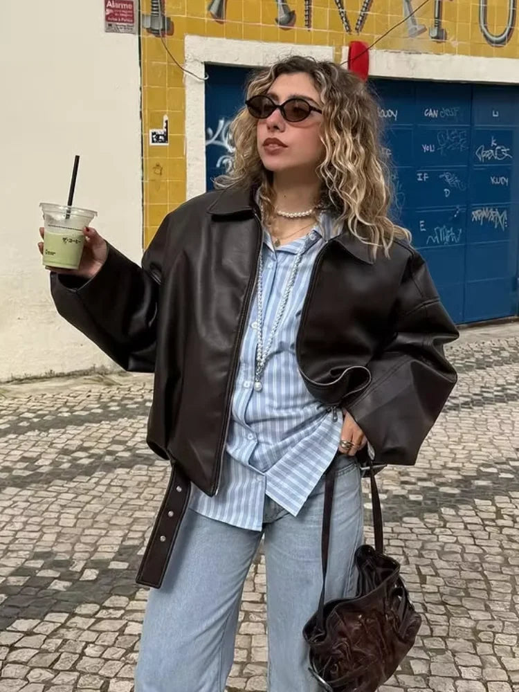 Vintage PU Leather Bomber Jackets 2025 Autumn New Ladies Zipper Lapel Long Sleeve Pocket Coat With Belt Women's Loose Streetwear