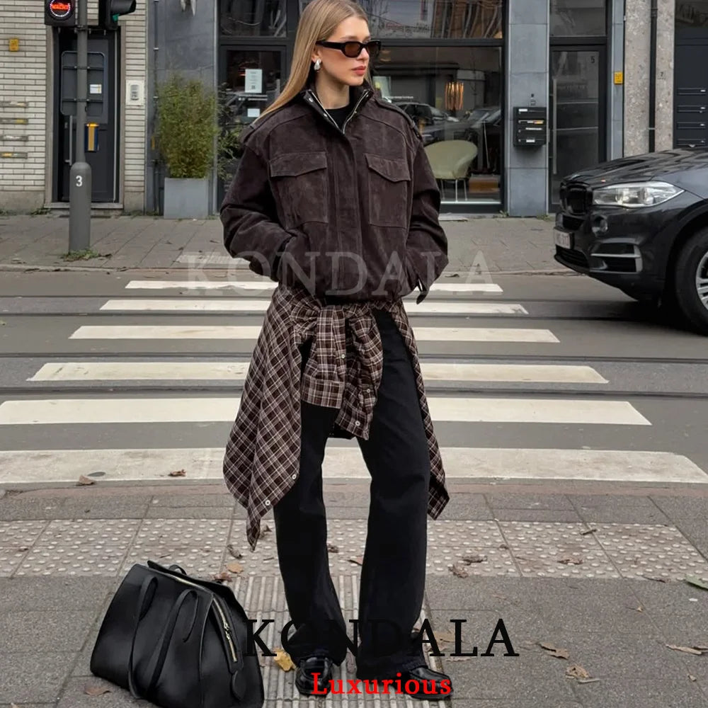KONDALA Chic Suede Women Bomber Jacket Women Long Sleeve Pockets Straight Loose Coat Fashion 2025 Fall Winter Streetwear Outwear