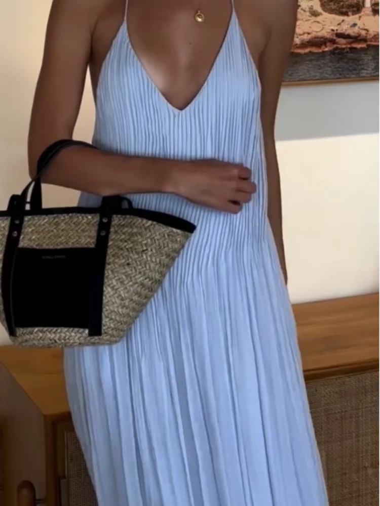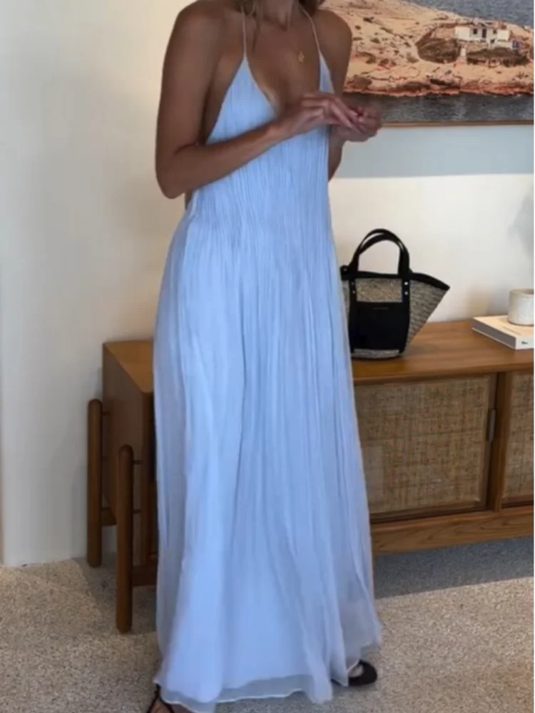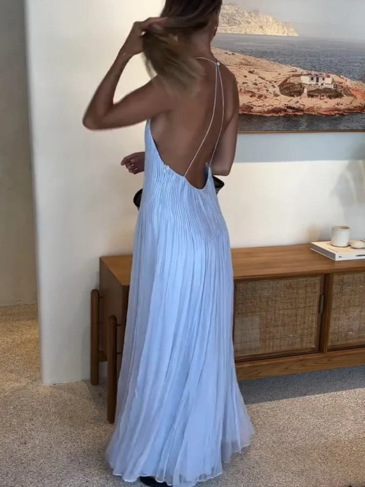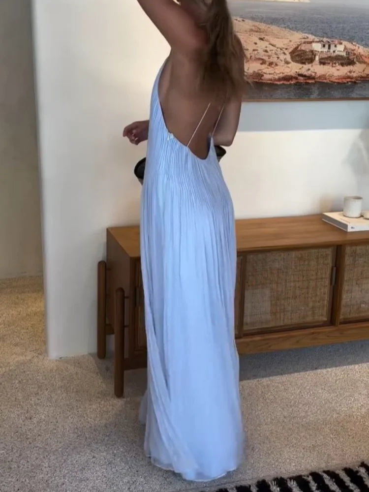 Light Blue Pleated Sling Long Dresses Women Sexy Backless Sleeveless A Line Robes Elegant Female Evening Party Club Gowns