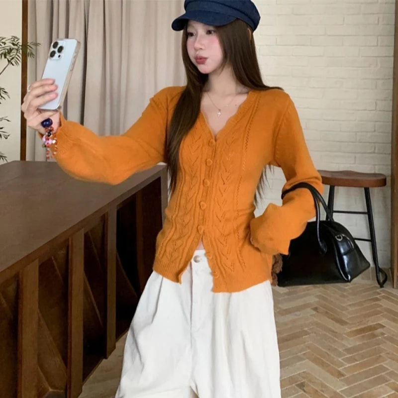 Y2K Vintage Hollow Out V-Neck Knitted Cardigan Women Sexy Slimming Sweater Coat Autumn Korean Chic Single-Breasted Knitwear Tops
