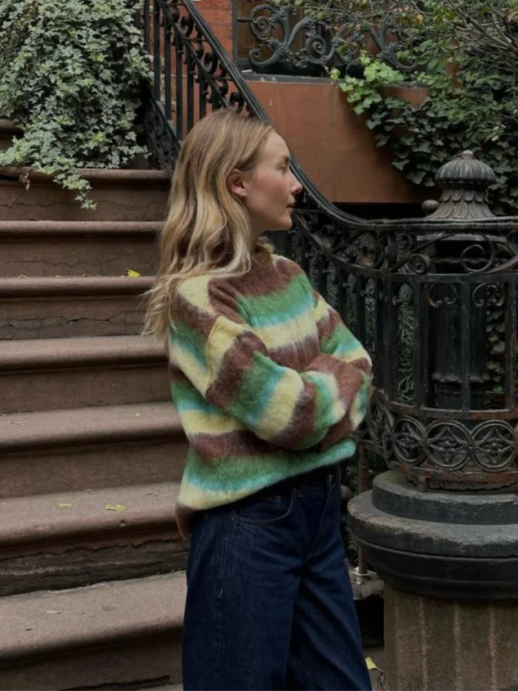 Fashionable Colorful Striped Sweater Chic Casual 2025 Autumn Winter Outfit Loose Round Neck Warm Knit Sweaters Maillard Style
