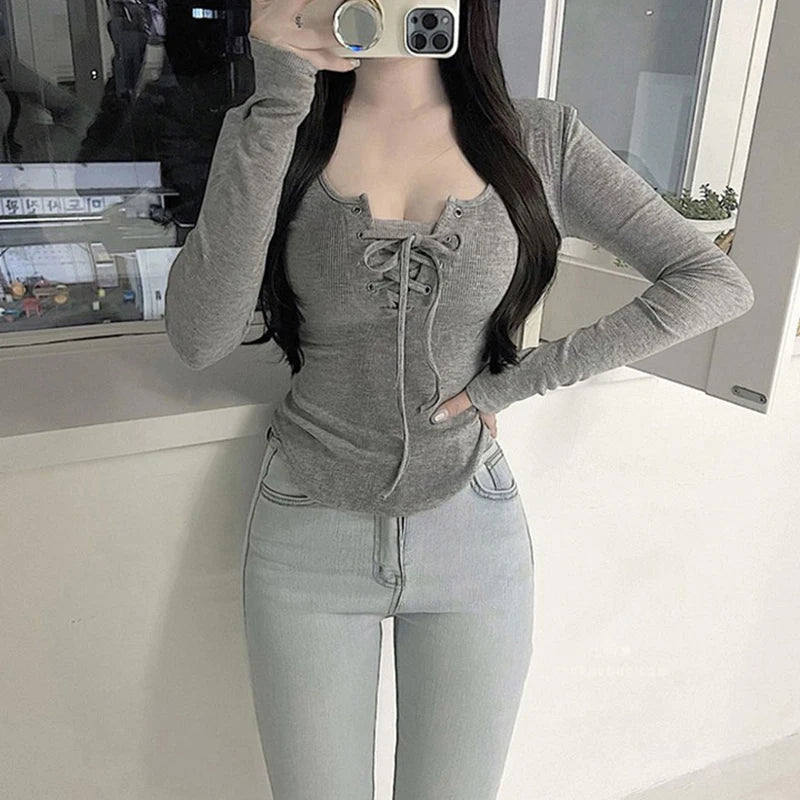 Autumn Sexy Women T Shirts Korean Lace Up Slim Long Sleeve Female Casual Tees Y2k Fashion New All Match Ladies Crop Tops