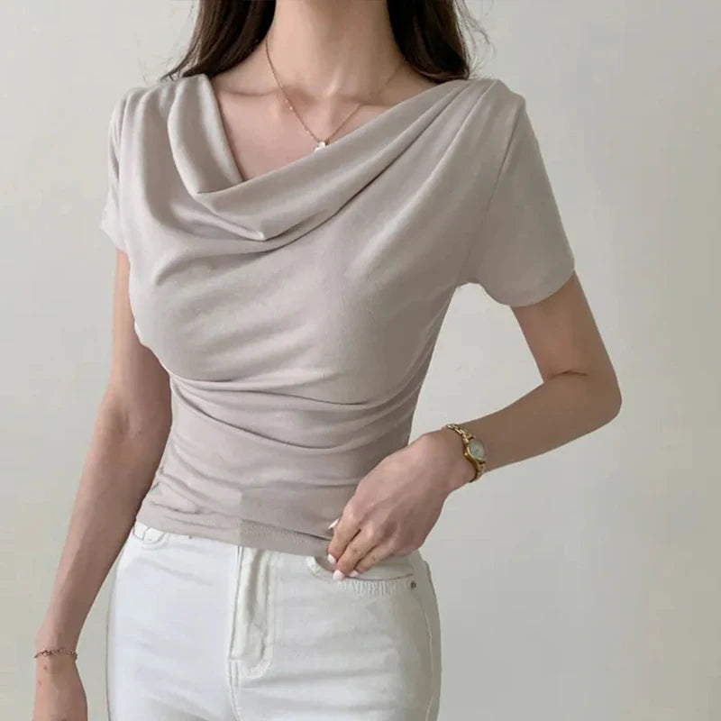 Summer Solid Women's T-shirts 2025 New Short Sleeve Irregular Collar Korean Casual Shirts Knitwear Sexy Slim Top Female