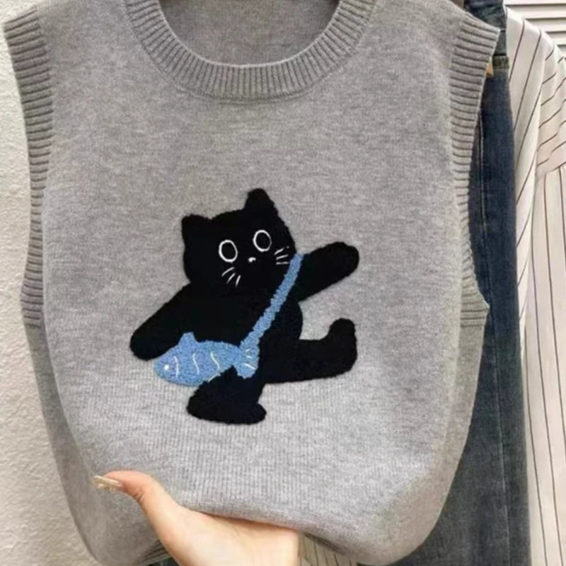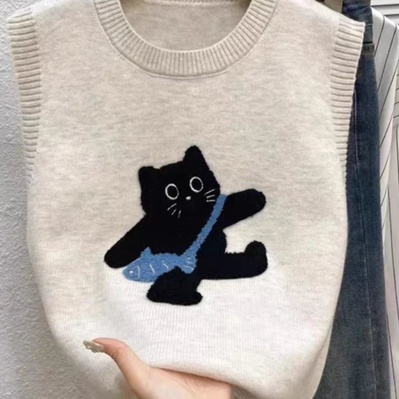 AOSSVIAO 2025 Women Knitted Tank Top Summer Fall Cartoon Sweater Short O Neck Sleeveless Solid Spring Sweaters Pullovers