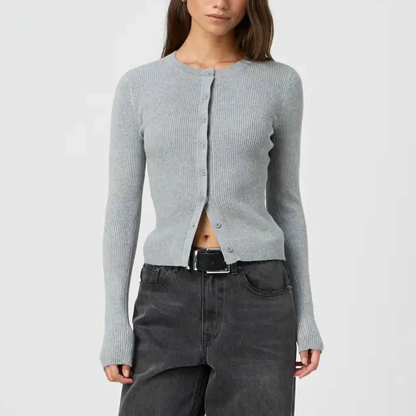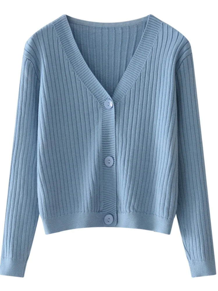 Women's Ribbed Cardigan Tops Spring Fall Solid Color Long Sleeve Round Neck Button Up Cropped Sweaters Female Casual Pullovers