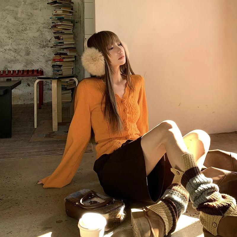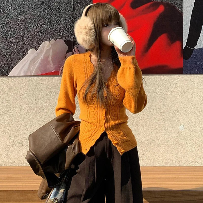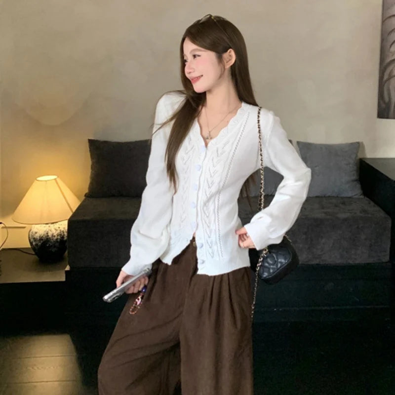 Y2K Vintage Hollow Out V-Neck Knitted Cardigan Women Sexy Slimming Sweater Coat Autumn Korean Chic Single-Breasted Knitwear Tops