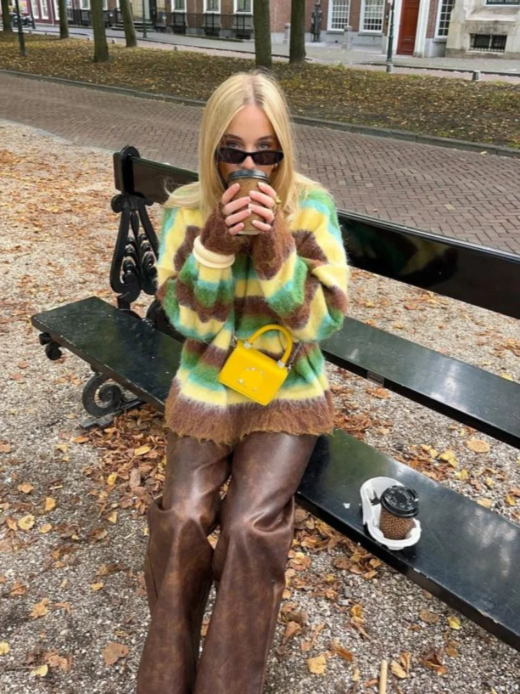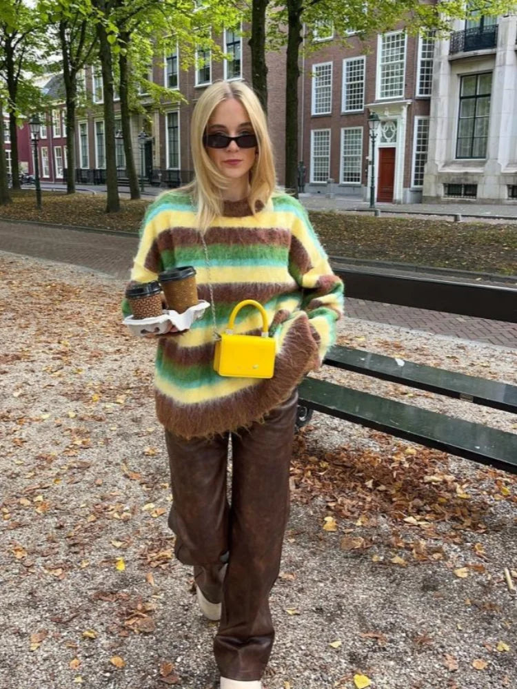 Fashionable Colorful Striped Sweater Chic Casual 2025 Autumn Winter Outfit Loose Round Neck Warm Knit Sweaters Maillard Style