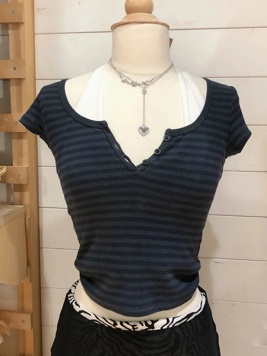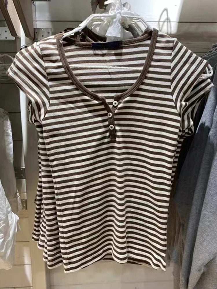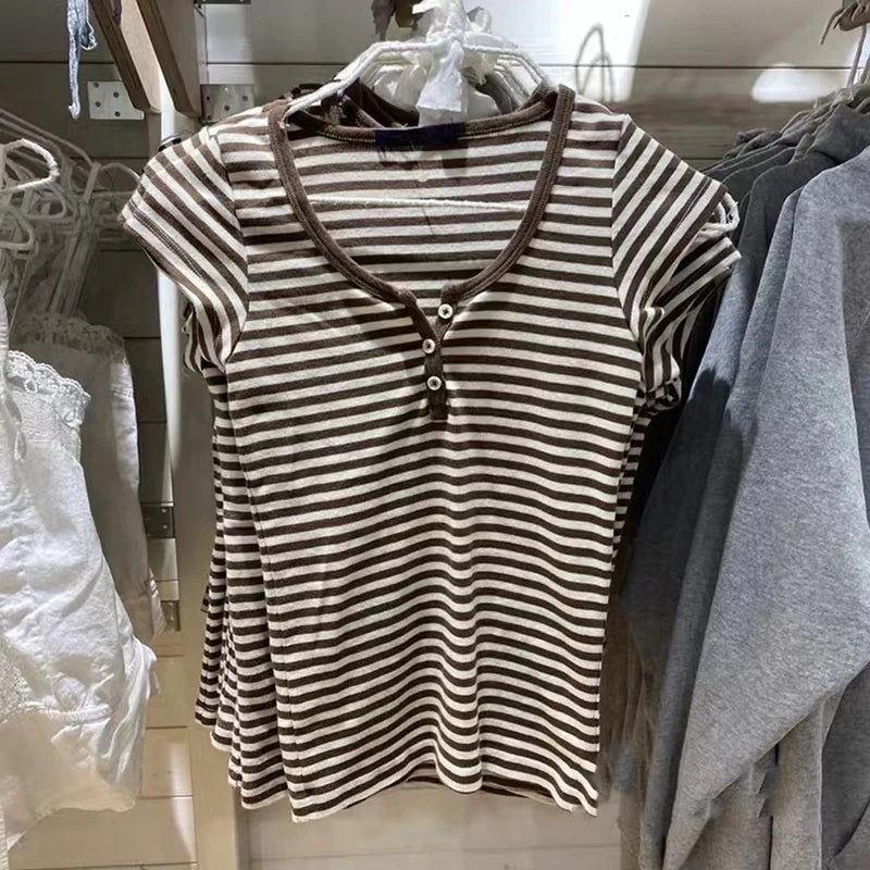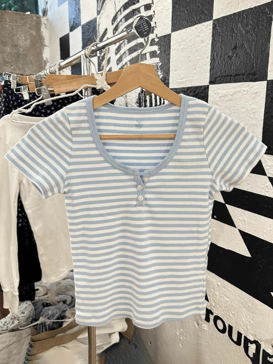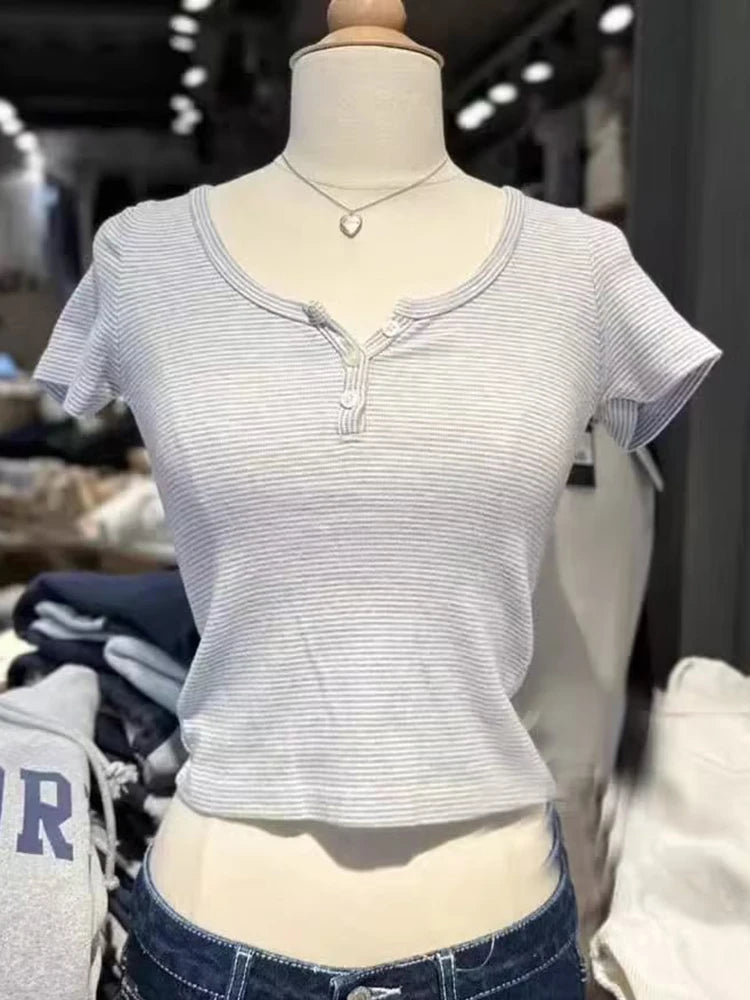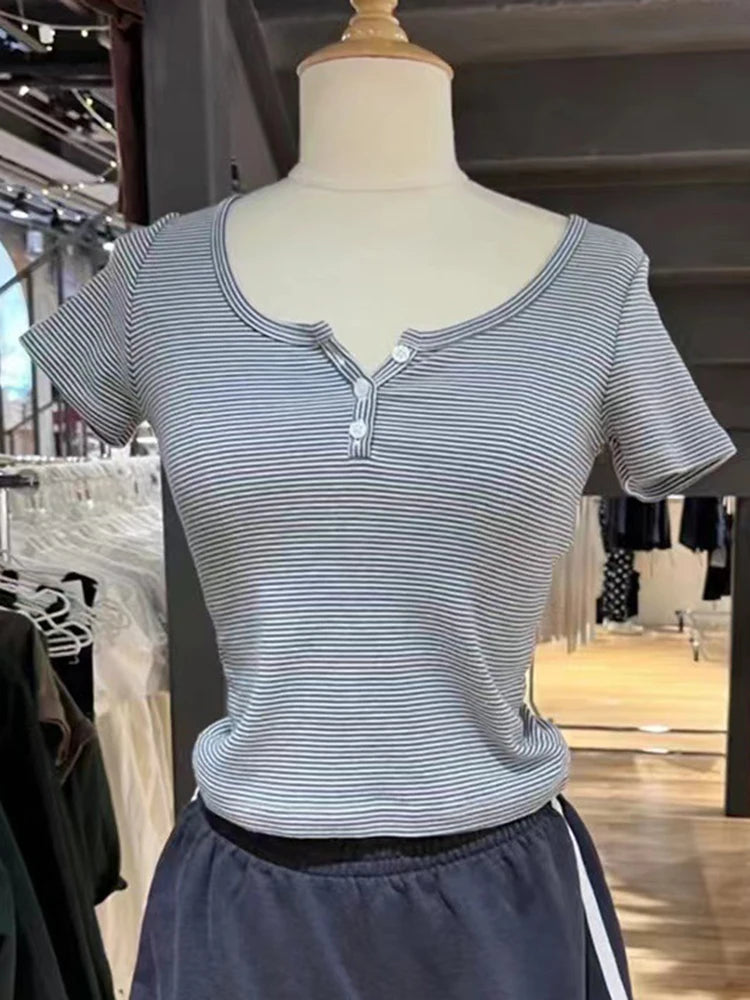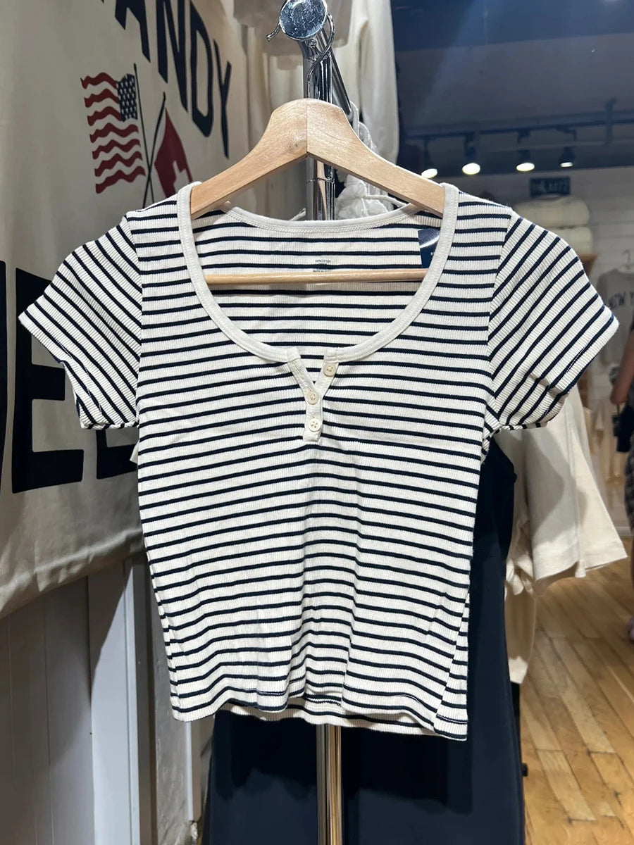 Women Classic Striped Slim Crop Top Summer Button O-Neck Soft Cotton Short Sleeve T-shirts Chic Sweet Fashion Y2k Tops Women