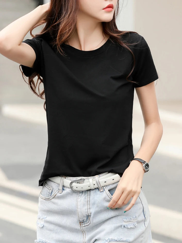2025 Summer Short Sleeve O-Neck Cotton Pink T-Shirt Women Solid Color Elegant Tshirts Lady Slim Soft Casual Fashion Tops