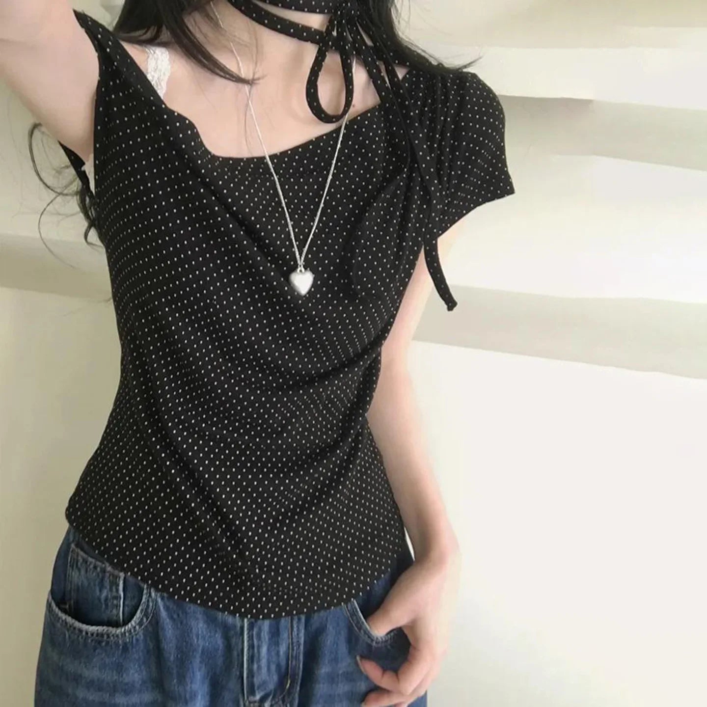 Sweet Polka Dot Prints T-Shirts Fashion Women Cute Design One-Shoulder Summer Tops Casual Korean Office Lady Commute Slim Tees