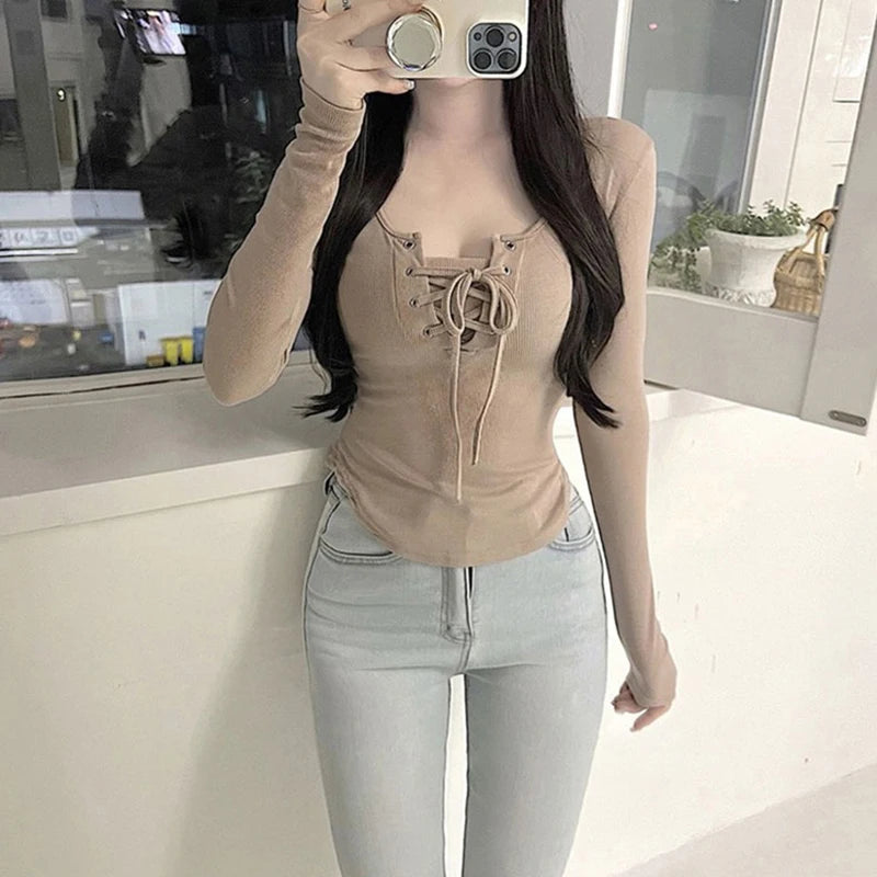 Autumn Sexy Women T Shirts Korean Lace Up Slim Long Sleeve Female Casual Tees Y2k Fashion New All Match Ladies Crop Tops