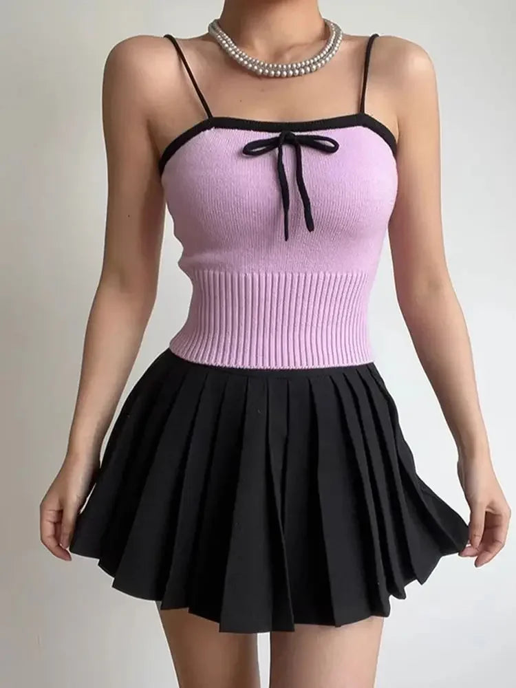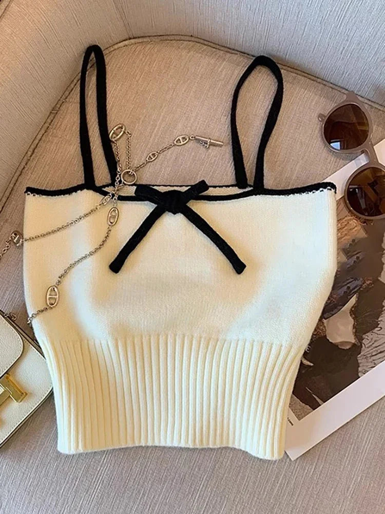 Women's Sexy Spaghetti Straps Cami Sweet Girl Bow Tie Knit Crop Top 2025 Summer Female Square Neck Tank Top