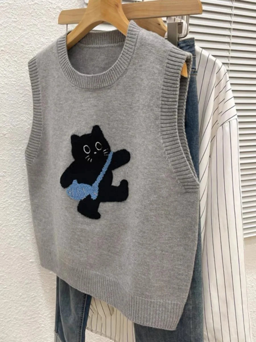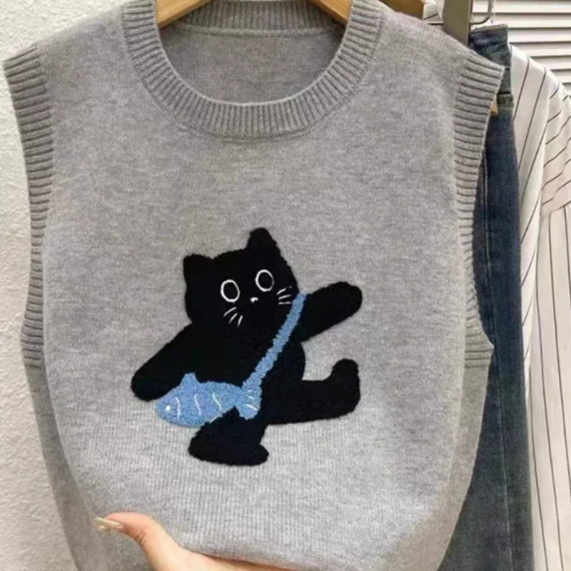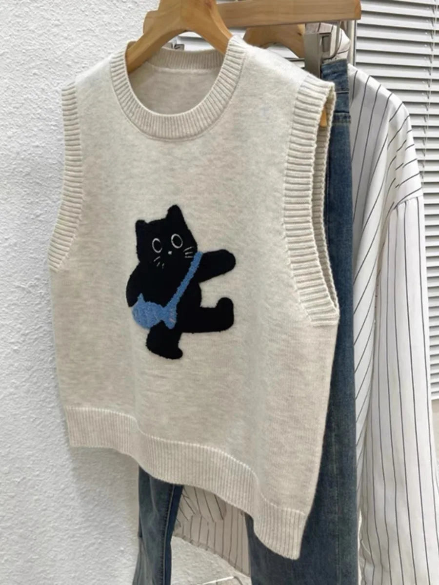 AOSSVIAO 2025 Women Knitted Tank Top Summer Fall Cartoon Sweater Short O Neck Sleeveless Solid Spring Sweaters Pullovers