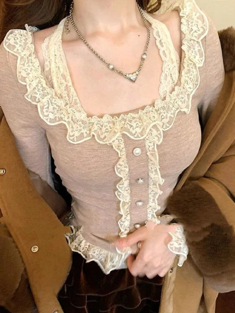 2025 Square Collar Lace Edge Splicing Long Sleeve Knitted Sweater Women's Retro Short Style Slim Tops Single-breasted Cardigan