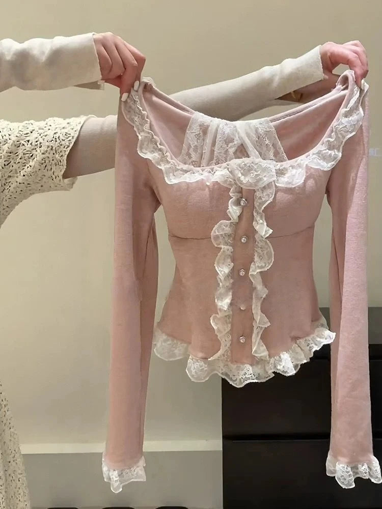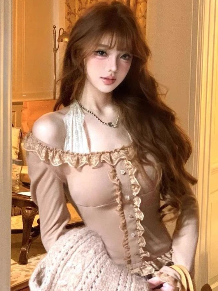 Japanese Sweet Lace Patchwork Blouses Women Long Sleeve Elegant Chic Bow Off Shoulder Tops New Cute Pretty Slim Lace Up Clothing